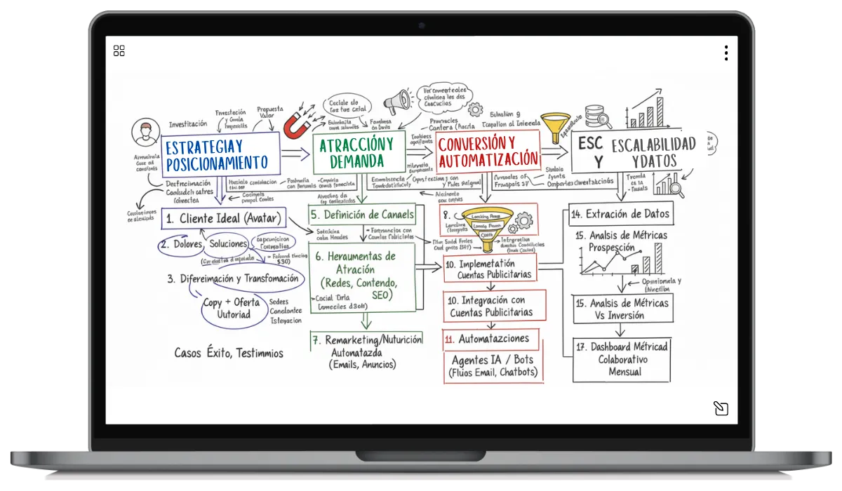 Dejamos atrás los servicios de agencia tradicional. No ejecutamos por ti indefinidamente. Construimos tu motor de marketing, te entregamos las llaves, y te enseñamos a manejarlo hasta dominarlo.
